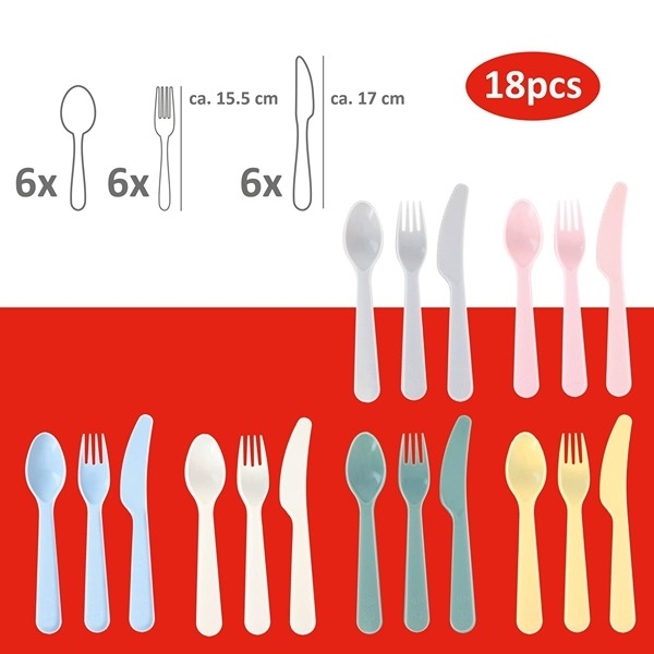 Her er et robust og praktisk plastikbestik sæt med 18 dele, der nemt kan anvendes både derhjemme og på farten. Sættet indeholder 6 skeer, 6 gafler og 6 knive af holdbart plastikmateriale. Både skeer og gafler har en længde på ca. 15,5 cm, mens knivene måler ca. 17 cm, hvilket gør dem perfekte for børn da de ligger godt i hånden uden skarpe kanter.