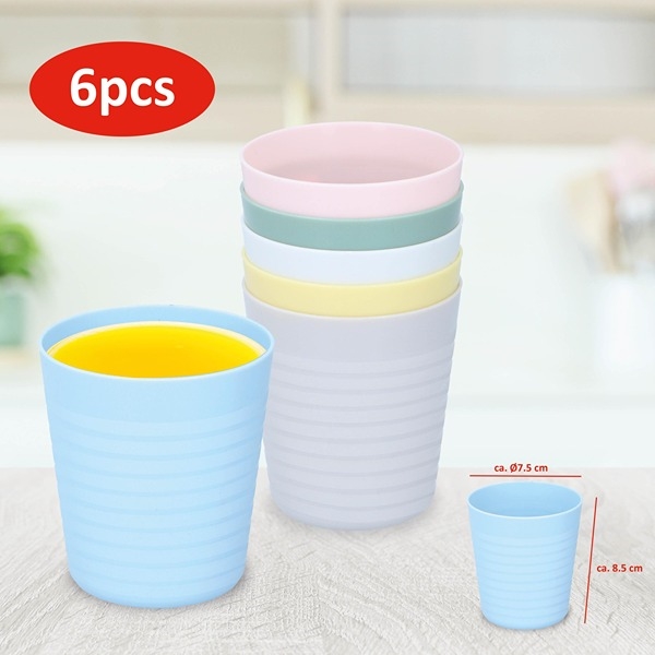 Få et sæt med 6 praktiske plastik krus, nemme at anvende i hverdagen og ideelle til udflugter. De er lavet af holdbart plastik og fungerer godt som mindre krus til både kolde og varme drikke. Med en højde på ca. 8,5 cm og diameter på ca. 7,5 cm ligger de godt i hånden, hvilket gør dem perfekte til børn og også velegnede som picnic eller camping krus.