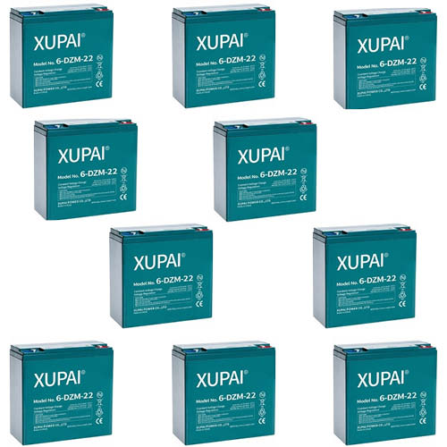 Her får du 10 stk XUPAI 6DZM22 22Ah batterier så du kan serieforbinde til 60V og parallelforbinde og have en kapacitet på 44Ah