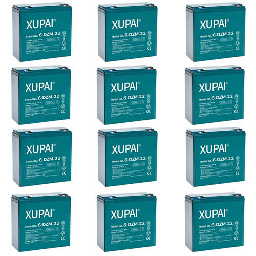 Her får du 12 stk XUPAI 6DZM22 22Ah batterier så du kan serieforbinde til 72V og parallelforbinde og have en kapacitet på 44Ah
