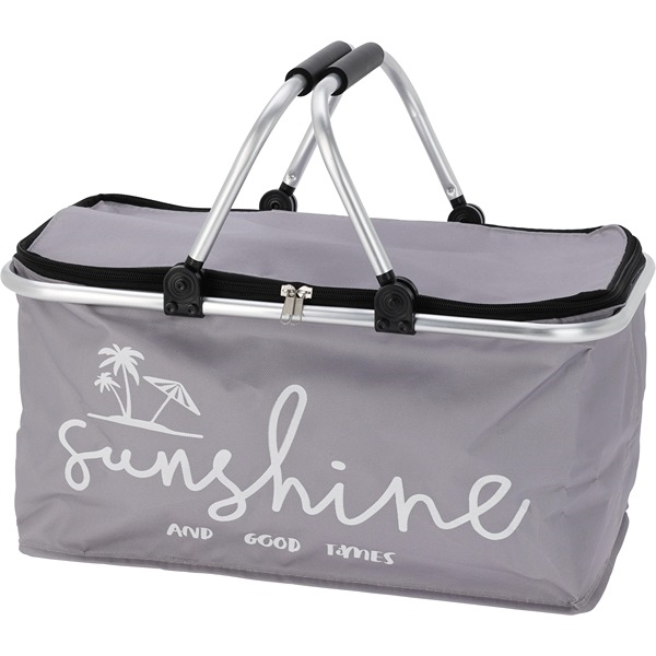 Denne smarte køletaske er lavet af holdbart 600D polyester, hvilket sikrer en langvarig brug. Det isolerede indre holder dine varer kolde i mange timer, hvilket gør tasken perfekt til picnic, strandture, camping og shopping. Aluminiumrammen og håndtagene giver både stabilitet og komfort ved bæring. Tasken kan nemt foldes flad til opbevaring, når den ikke er i brug. Den fine kølekurv har teksten "Sunshine and good times". Lynlåsen sørger for, at kulden bliver inde under transport.
