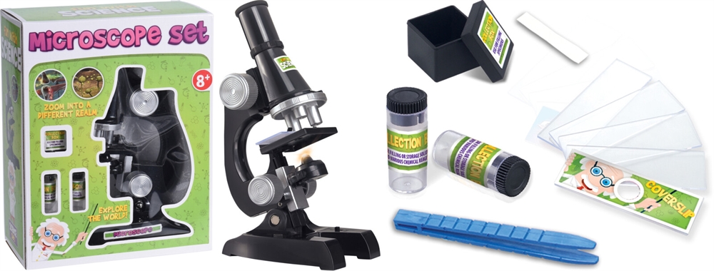 Mikroskop sæt med lys. Indeholder 2 samleflasker, 1 æske, 5 ark, 1 pincet, 5 blanke labelklistermærker.