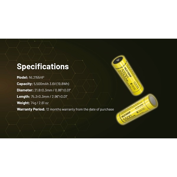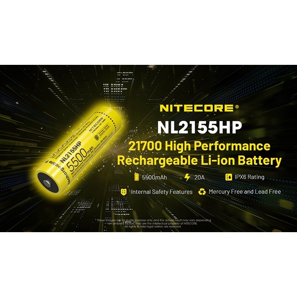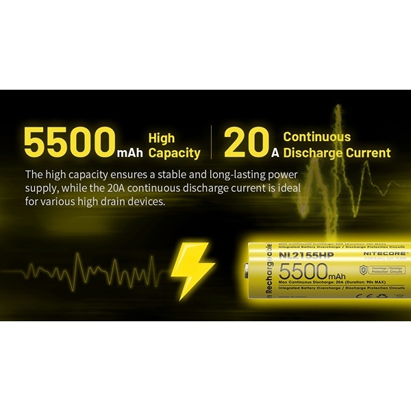 Nitecore NL2155HP er et kraftfuldt 21700 Li-ion batteri med en kapacitet på 5500mAh og en konstant afladningsstrøm på 20A, ideelt til stærke lommelygter og andet højeffektudstyr. Batteriet sikrer langvarig drift og stabil ydeevne, samtidig med at det har avancerede sikkerhedsfunktioner. Det er IPX6-klassificeret og vejer kun 74 g.