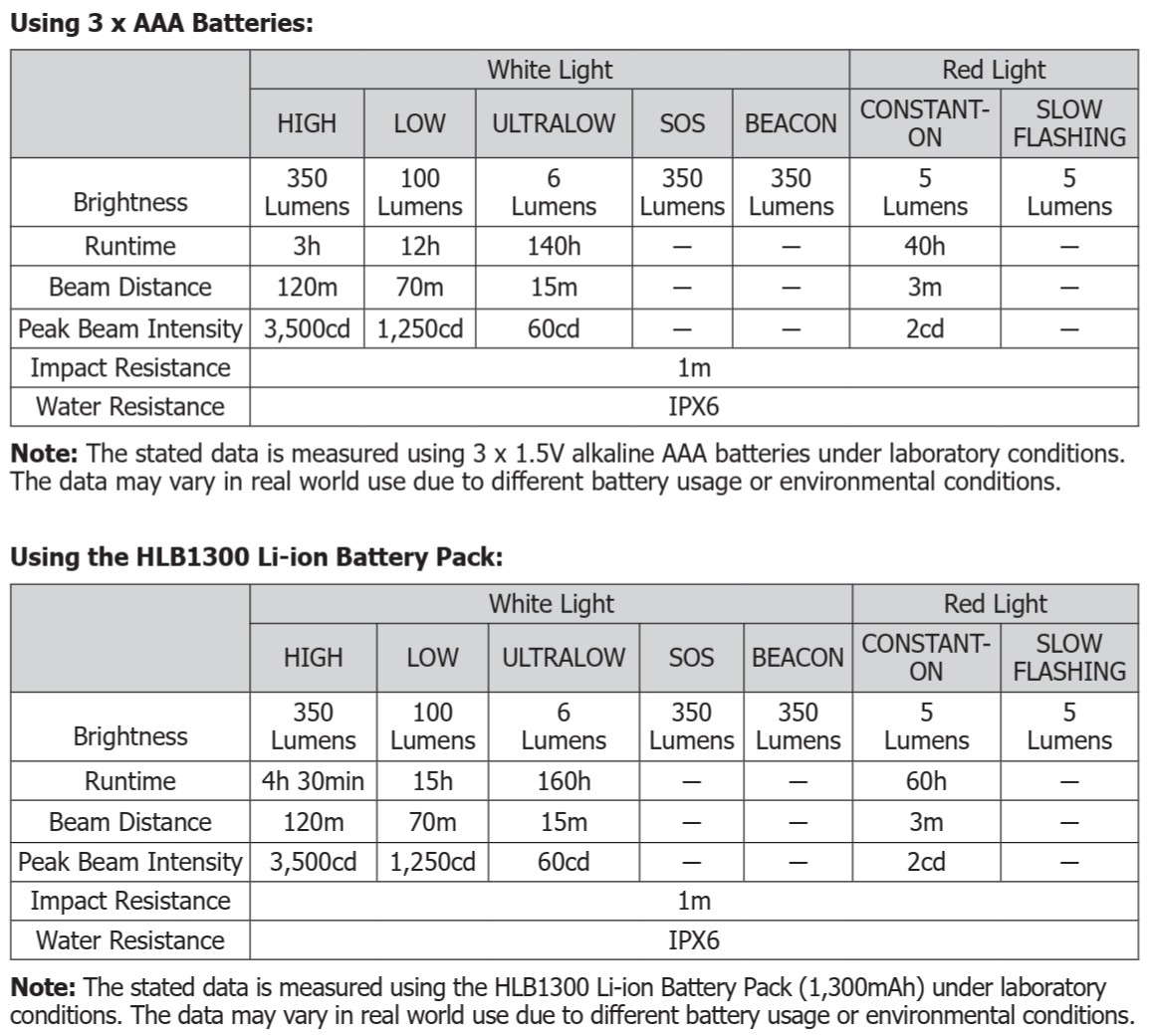 Drifttid ved højeste lysstyrke (Hvid/350 lumen) HLB1500 : 4 timer og 30 min