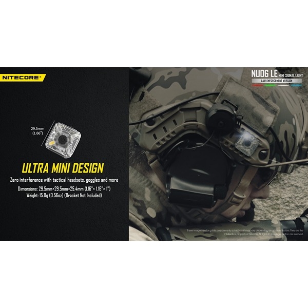 Tre monteringsmuligheder medfølger: magnetisk hook-and-loop, buet hjelmholder og MOLLE-beslag til veste og rygsække. Nitecore NU06 LE er IP66-klassificeret, hvilket gør den støv- og vandtæt samt slagfast op til 1 meter.