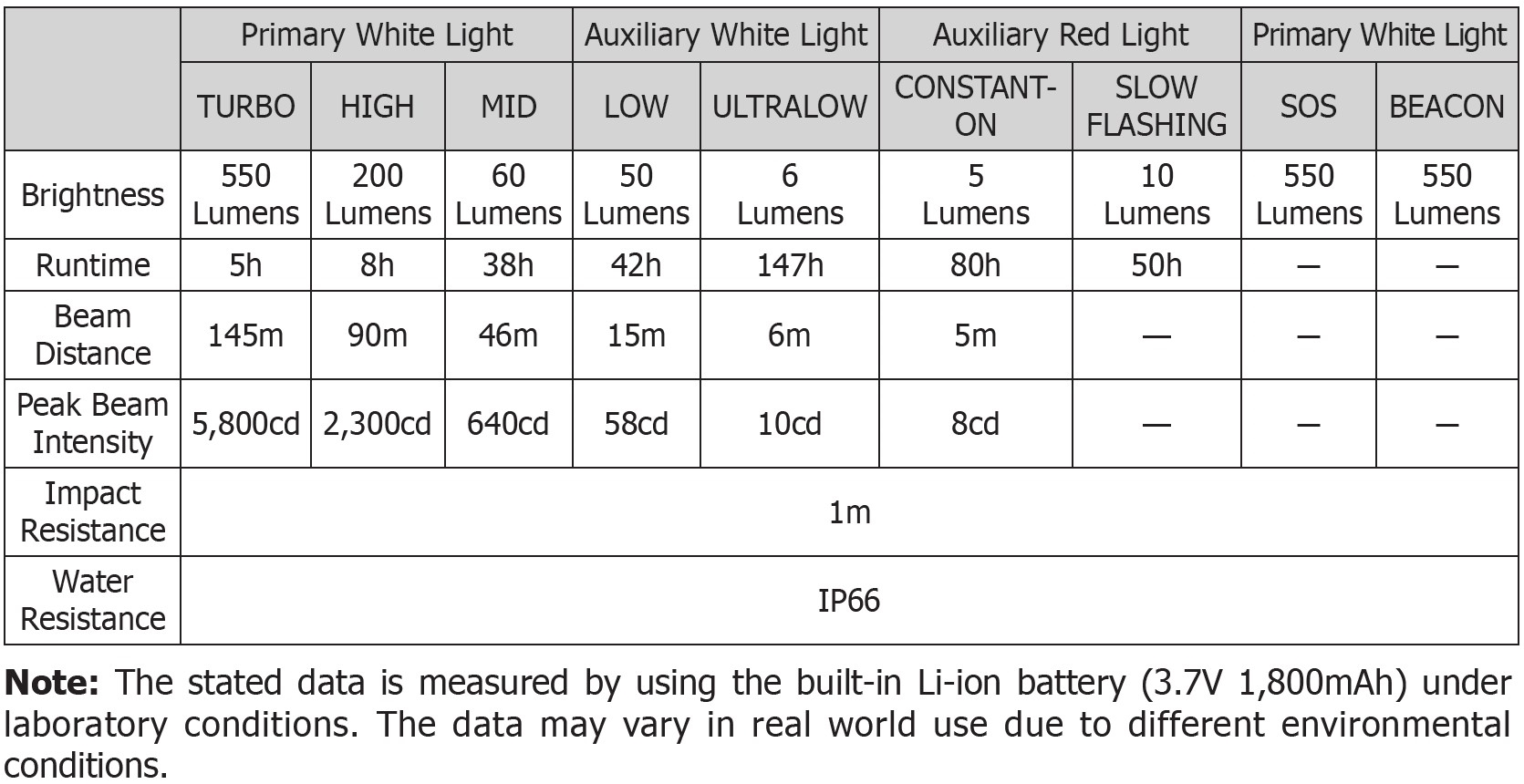 Den effektive LED yder op til 550 lumen og lyser cirka 145 meter i TURBO-tilstand. Du får både hvidt high-CRI floodlight til opgaver tæt på samt rødt lys, som kan bruges, når du vil bevare nattesynet – praktisk til kortlæsning, lejrliv eller jagt. De to markante knapper ovenpå gør det hurtigt at skifte mellem niveauer, også når du har handsker på.