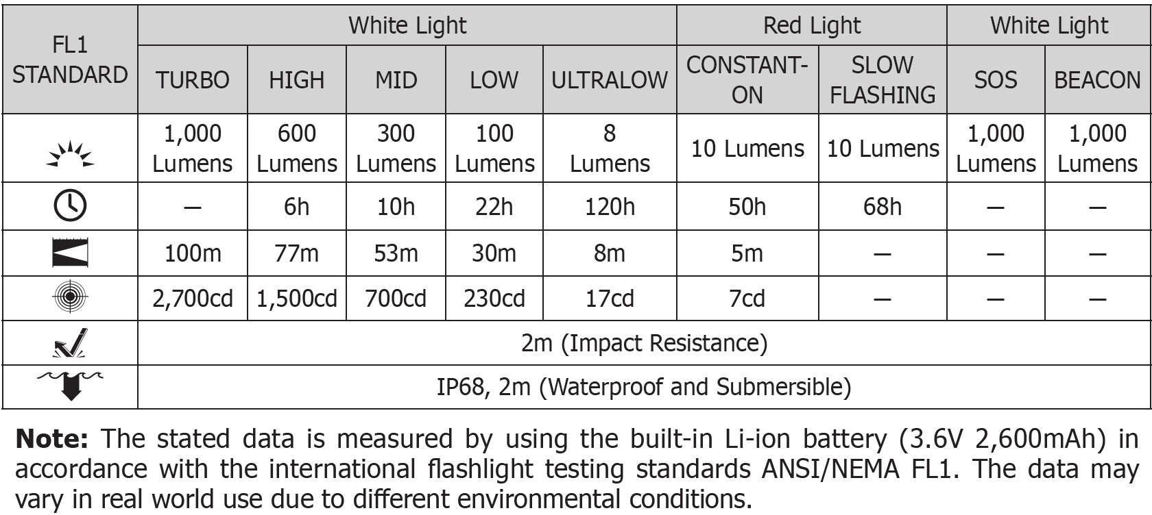 Drifttid ved laveste lysstyrke (Hvid/8 lumen): 120 timer