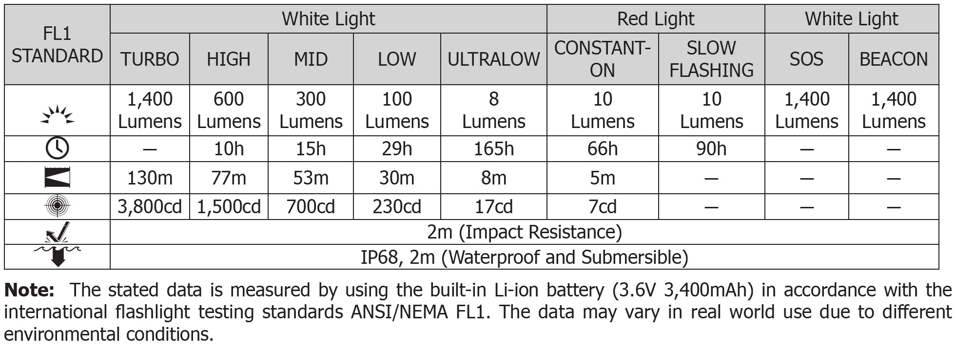 Drifttid ved laveste lysstyrke (Hvid/8 lumen): 165 timer