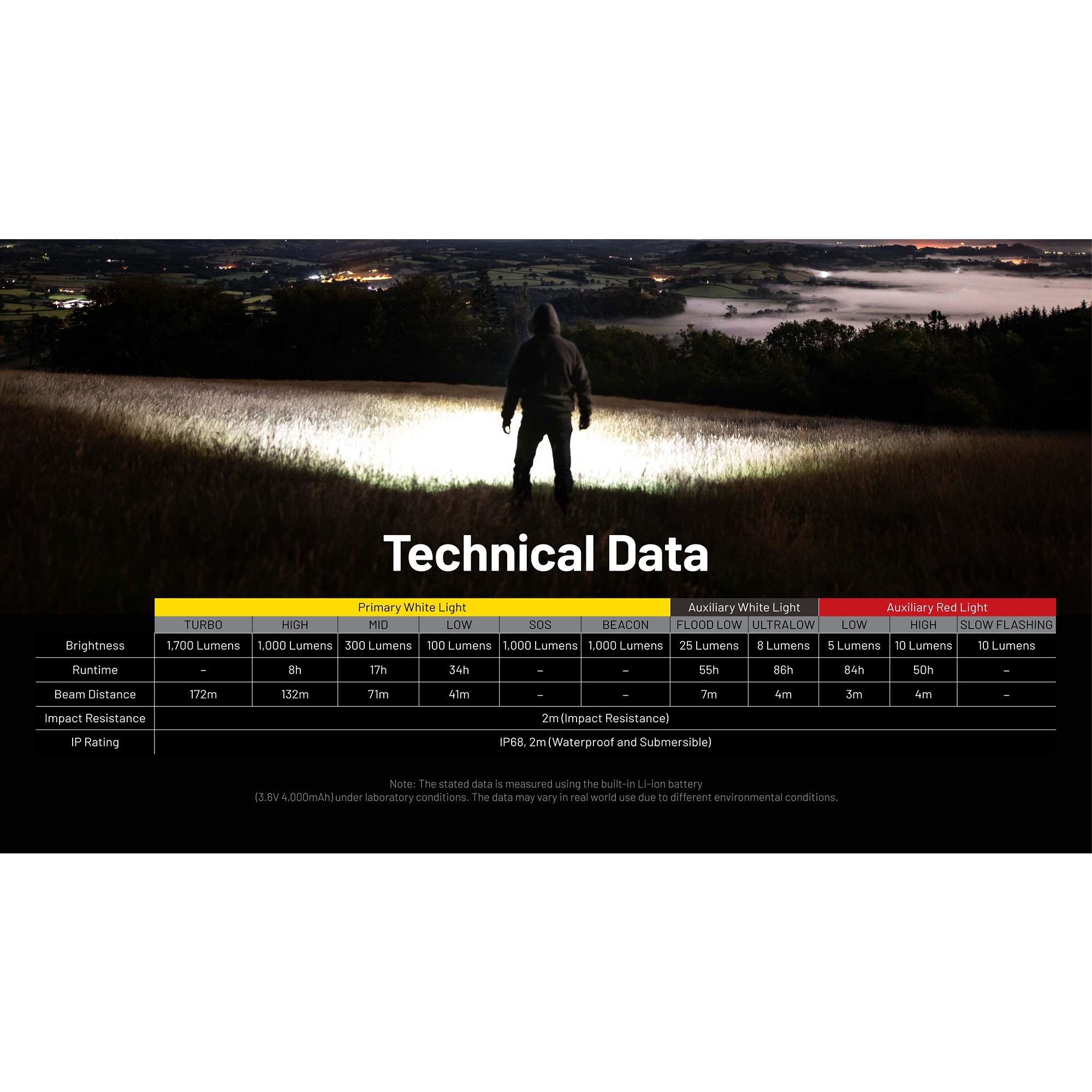 • 1700 lumen og en rækkevidde på 172 meter giver masser af lys til sti, lejr og arbejdsområde.