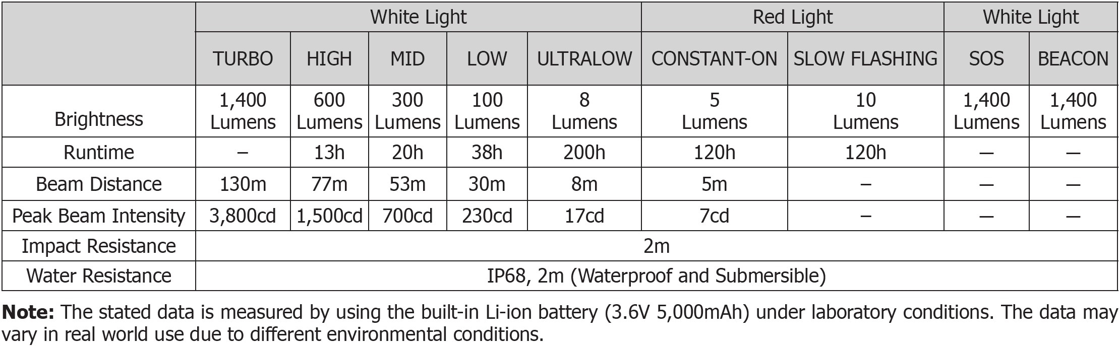 • Op til 1400 lumen og ca. 130 meters rækkevidde