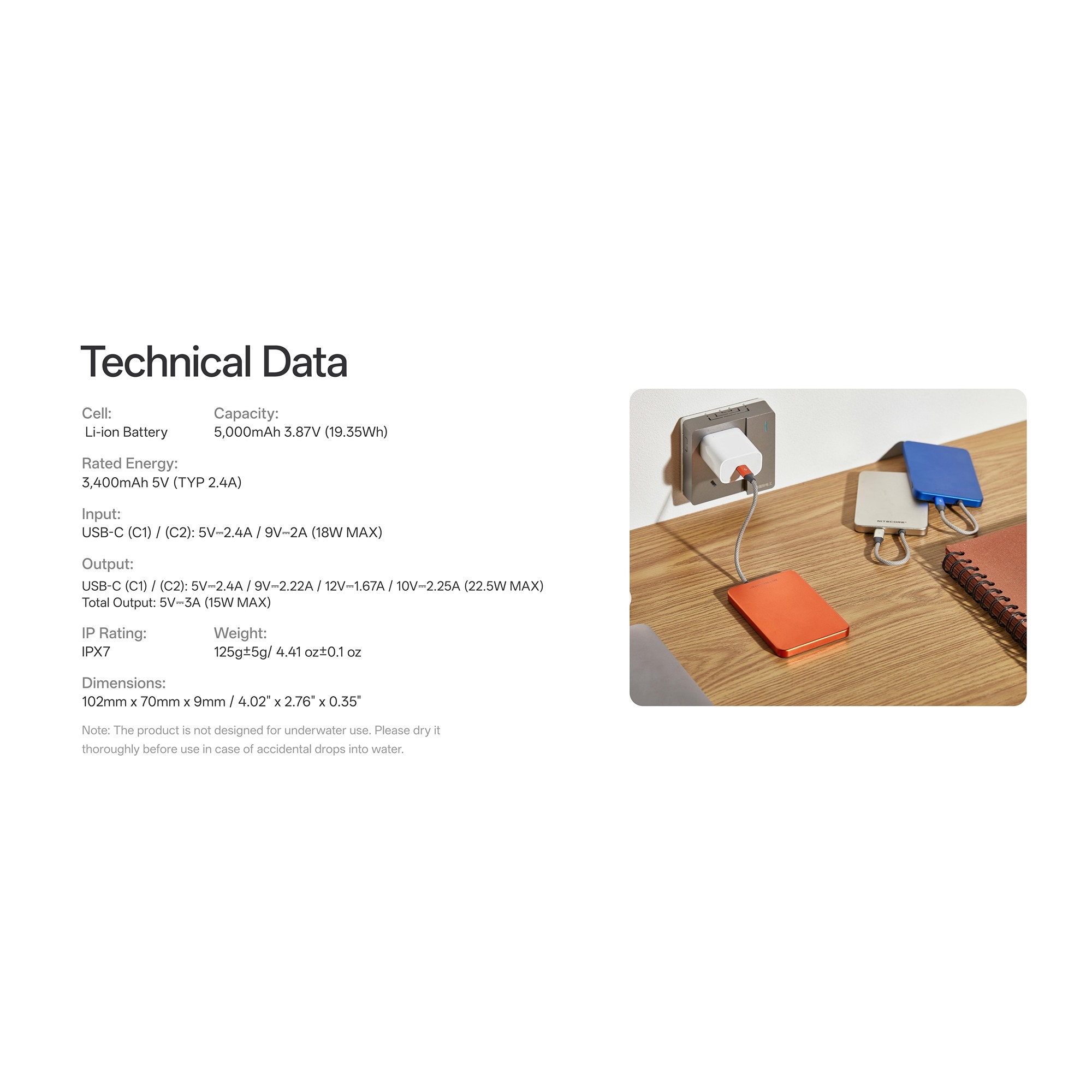 Nominel energi: 3400 mAh 5V (TYP 2,4A)
