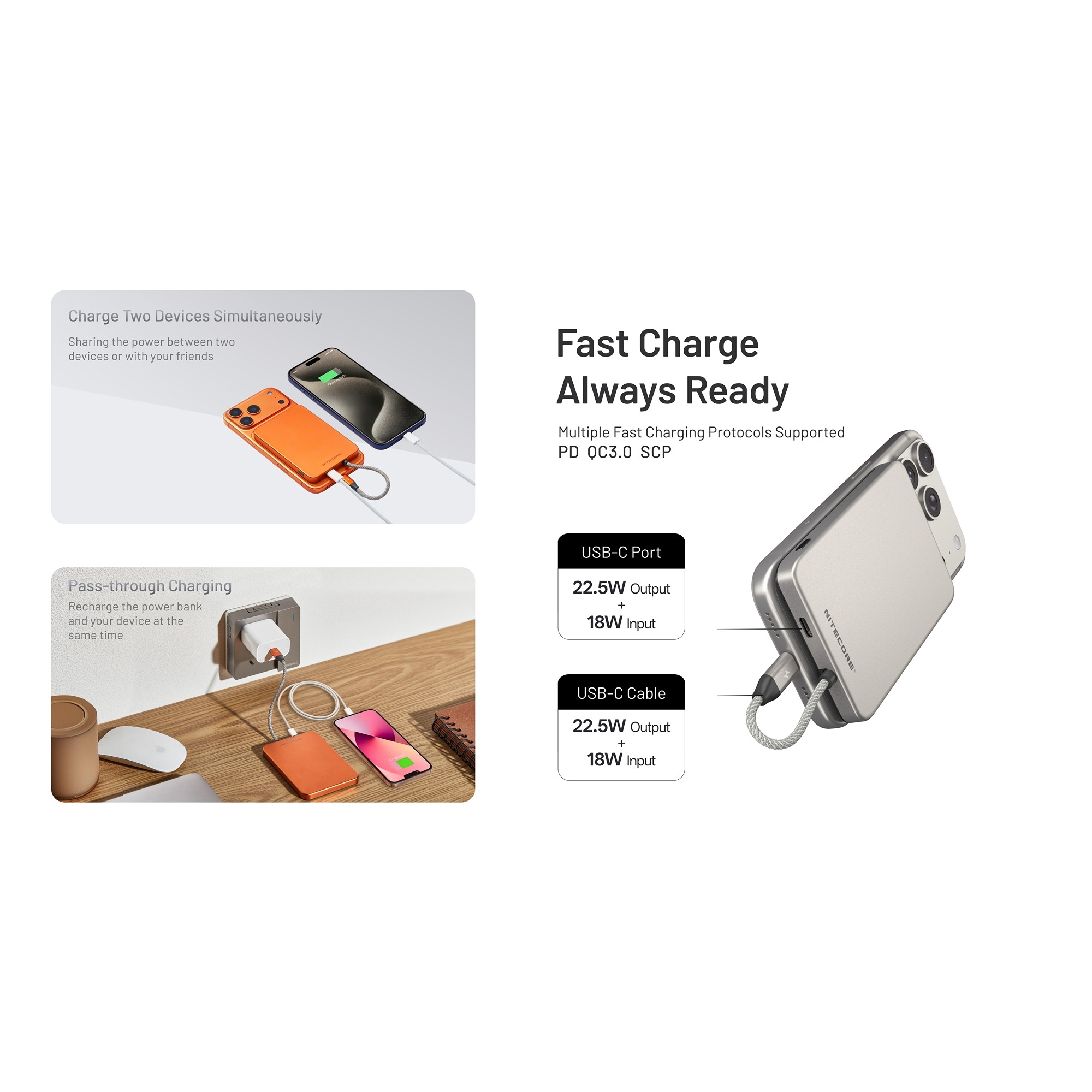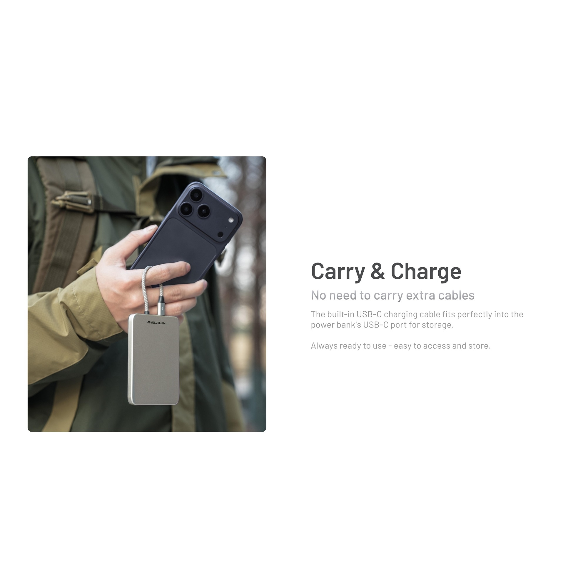 Det unikke ved Nitecore POCKET 5 er magnetfunktionen, så powerbanken kan sættes fast på kompatible smartphones eller covers med magnet. Modellen understøtter ikke trådløs opladning, men kommer i stedet med et integreret USB-C-kabel. Dermed kan du oplade, mens powerbanken sidder solidt på telefonen, og du undgår at den dingler i kablet.
