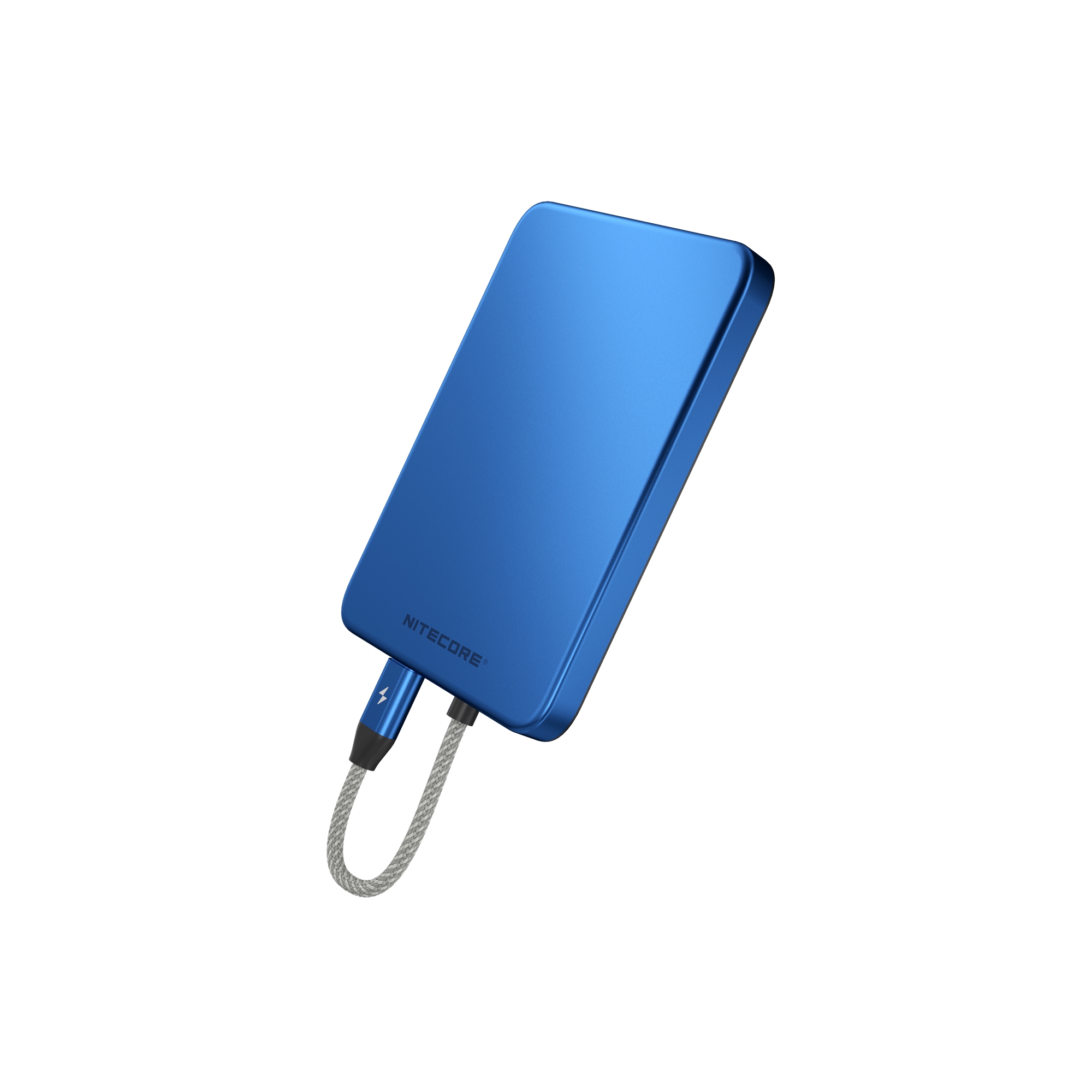 Den blå farve giver et tydeligt look, og det flade design med afrundede hjørner gør Nitecore POCKET 5 nem at have med som mobiloplader i tasken.
