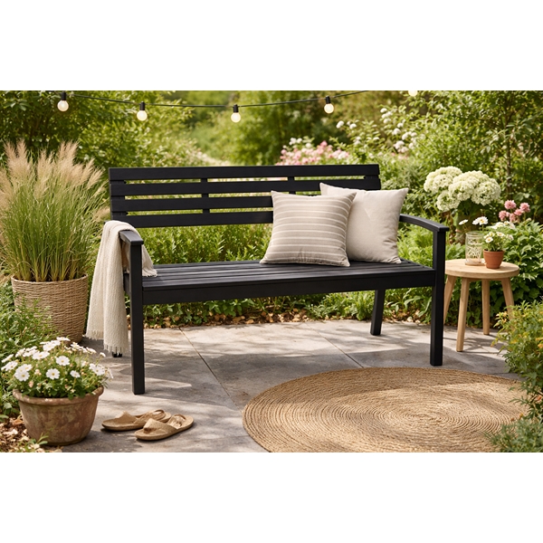 Produkt:  Sort havebænk i Polywood med armlæn, 115 cm lang