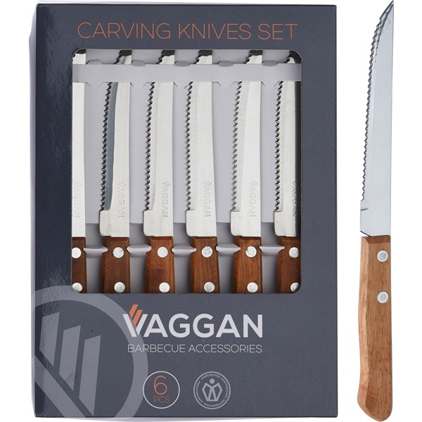 Disse steakknive fra Vaggan er skabt af holdbart rustfrit stål. Den takket klinge sikrer nem udskæring af steaks, grillkød og andre kødanretninger uden at beskadige teksturen. Hver kniv har et ergonomisk designet håndtag i robust eucalyptus-træ og er sammensat med to nitter for en stabil og klassisk stil. Knivene har en længde på 21 cm, og bladets tykkelse er 1,0 mm. For at bevare træhåndtagene anbefales håndvask fremfor opvaskemaskine.
