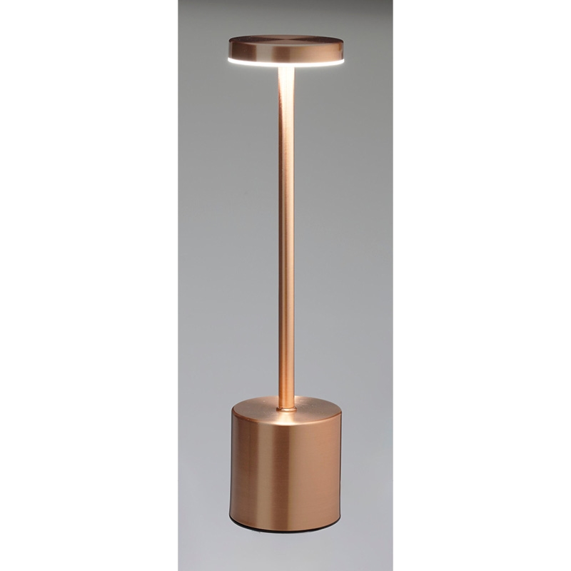 Elegant, enkel bordlampe i kobber (H: 34 cm), der passer godt i stue, soveværelse eller på kontoret. Den trådløse LED-lampe styres med touch og kan skifte mellem 3 lysnuancer: varm hvid, hvid og kombination af varm hvid og hvid. Lysstyrken reguleres let med den integrerede dæmper ved at holde fingeren på touchfladen.