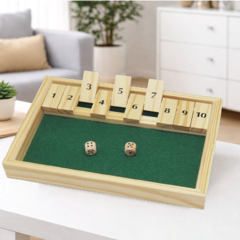 Spilleren kaster terningerne på den grønne filt og vælger én eller flere nummerklaffer (1–10), som tilsammen udgør summen. Når der ikke er flere muligheder tilbage, afsluttes runden. Flest point går til den spiller med den laveste restsum. Shut the Box forbedrer talforståelse, fokus og strategi.
